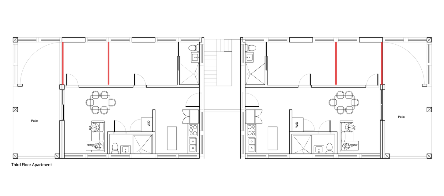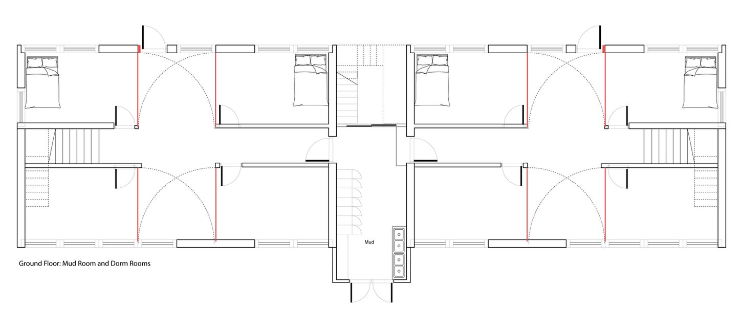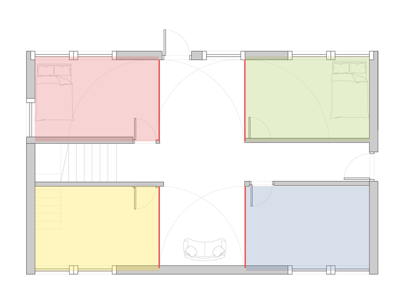 The base configuration of the first floor contains four rooms. When the partition walls are opened, these rooms expand into 10' x 25' spaces, providing more room for individual occupants when hosting informal visitors. At maximum capacity, the first-floor layout can accommodate up to six beds.