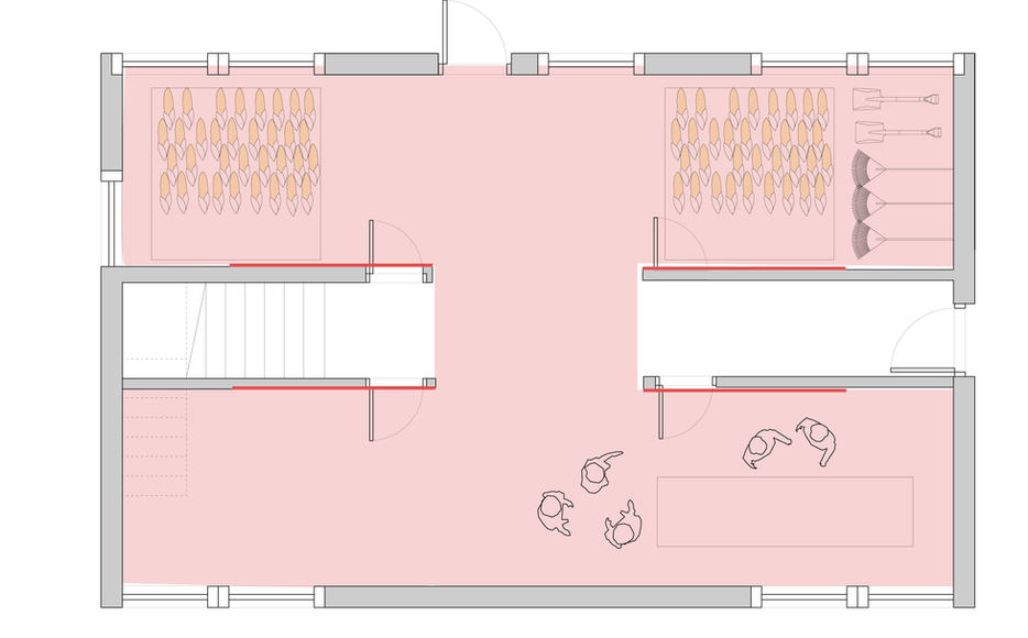 Currently, the local farmers are sharing lease for barn space rental from chester farm. The project proposes to use movable partition to open up the ground floor of the structure when not occupied as dorms into winter barn spaces. During the winter season, when seasonal workers are not occupying the units, the partitions can be fully opened to transform the floor into a large flexible space. Farmers can then repurpose the area for storage or communal activities as needed, such as storing small farming equipment, processing food, making kimchi, or drying corn.